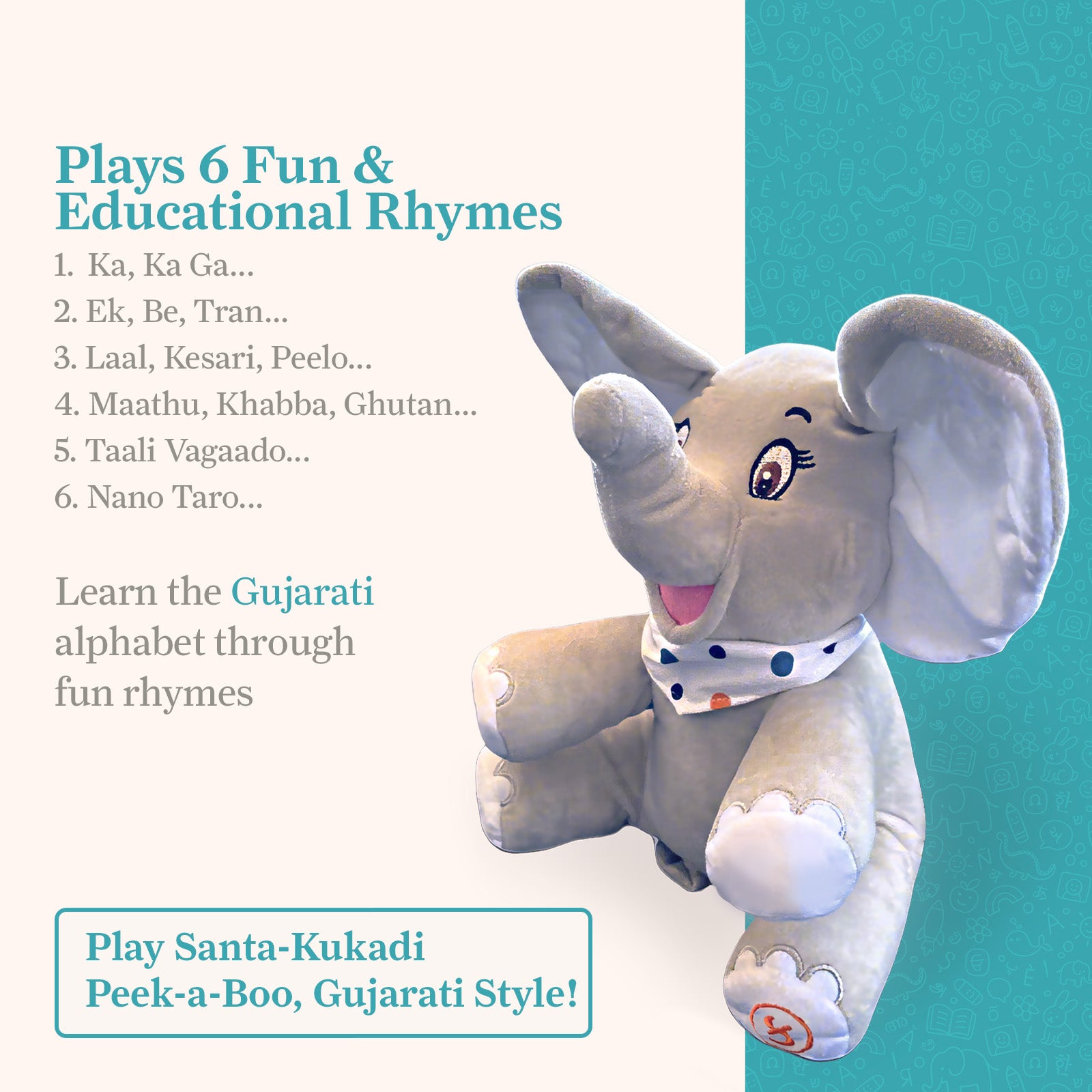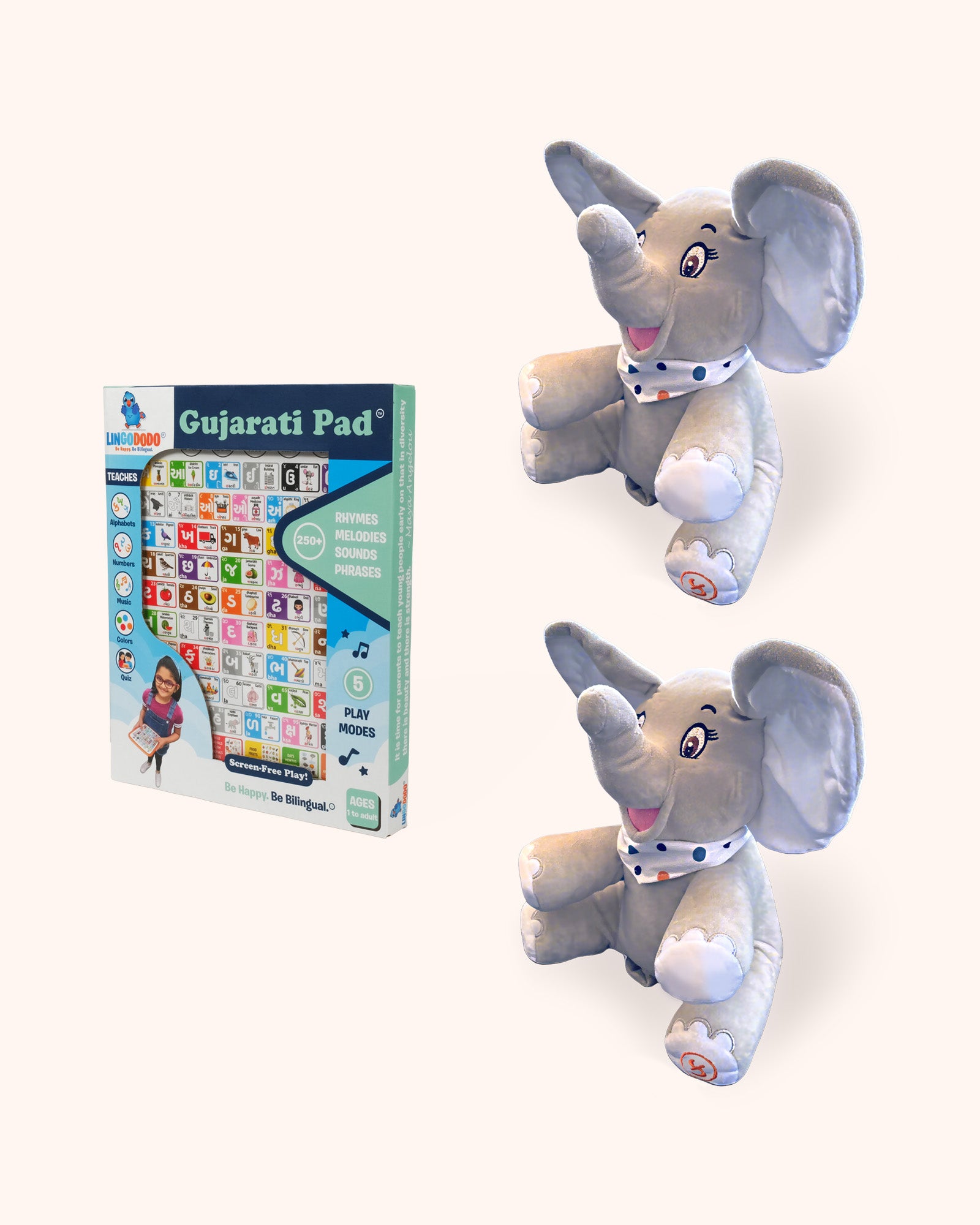The Gujarati Pad and matching Gujarati Elephant work together to create a joyful learning experience that blends structured learning with imaginative play. Kids can press, listen, sing, and play, all without apps, screens, or setup.